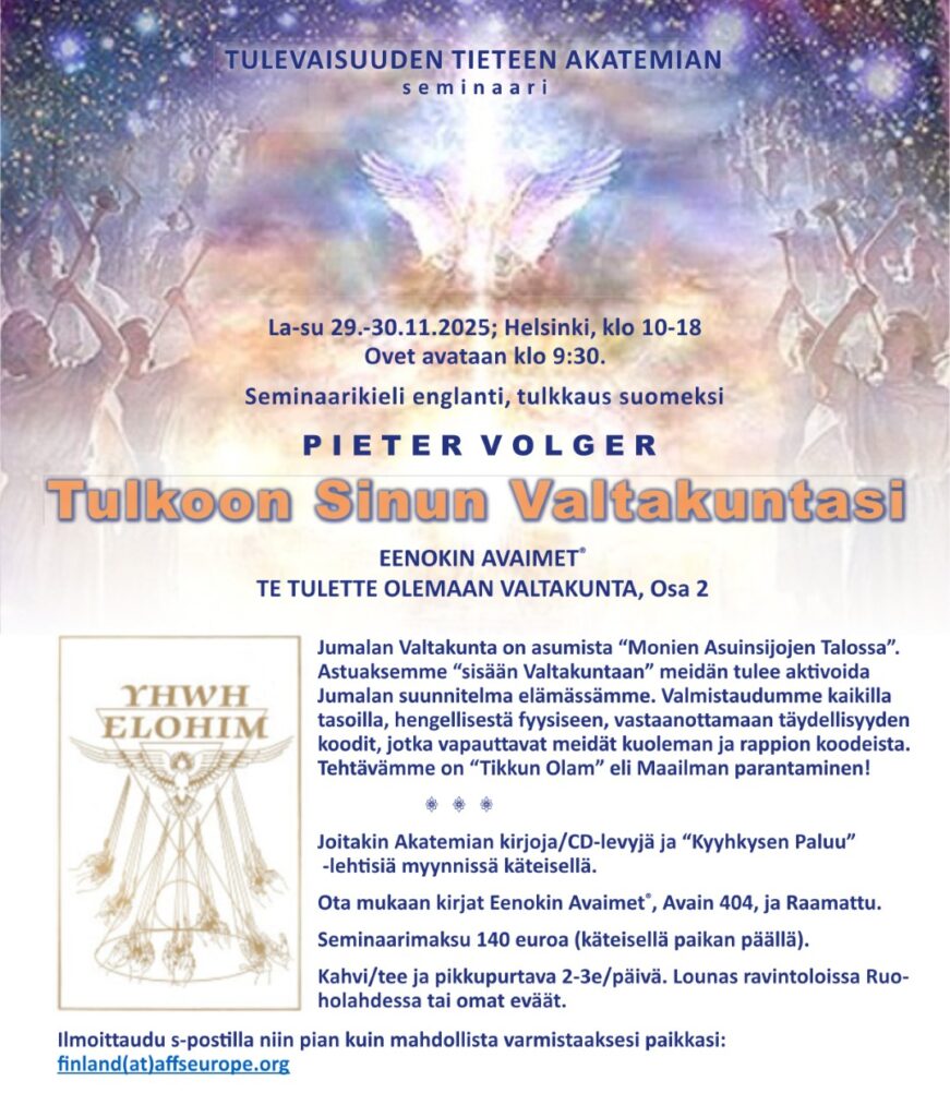 Jumalan Valtakunta on asumista “Monien Asuinsijojen Talossa”. Astuaksemme “sisään Valtakuntaan” meidän tulee aktivoida Jumalan suunnitelma elämässämme. Valmistaudumme kaikilla tasoilla, hengellisestä fyysiseen, vastaanottamaan täydellisyyden koodit, jotka vapauttavat meidät kuoleman ja rappion koodeista. Tehtävämme on “Tikkun Olam” eli Maailman parantaminen!